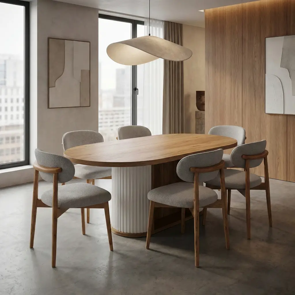 - Masa: Ceviz desenli açılır tabla, naturel ahşap ayaklar.