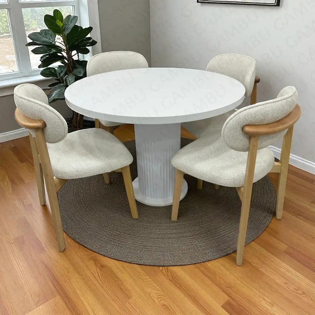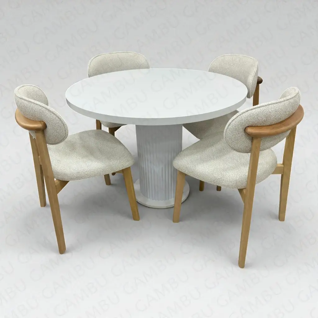 Yuvarlak Bohem Takım, doğal ve modern çizgilerin bir araya geldiği zarif bir oturma grubudur. Takım; 4 adet Norte ahşap sandalye ve 1 adet yuvarlak bohem ayaklı masa ile birlikte sunulur. Norte sandalyelerin masif ahşap gövdesi ve sade tasarımı, yuvarlak bohem masanın estetik ve güçlü ayak yapısı ile mükemmel bir uyum sağlar. Gerek ev içi yemek alanlarında gerekse kafe, restoran ve otel projelerinde şıklığı ve dayanıklılığıyla öne çıkar.
