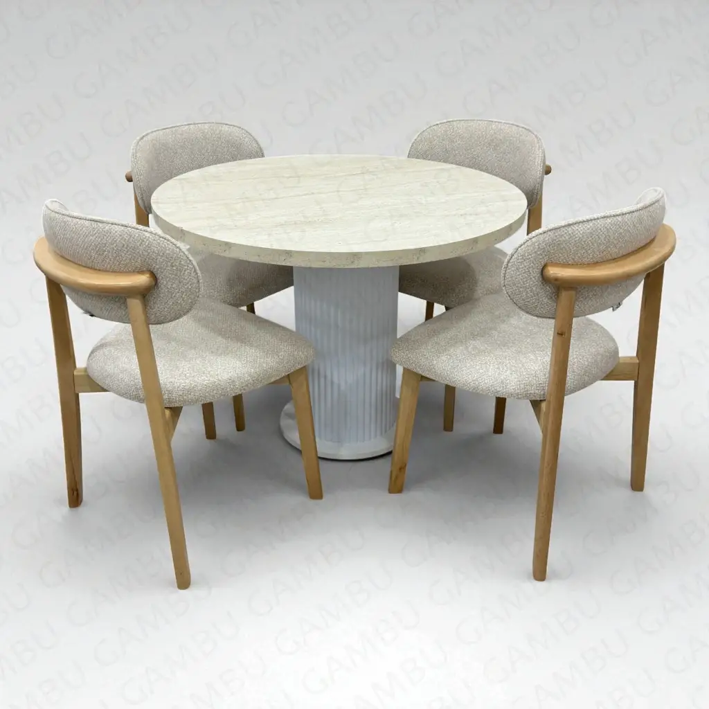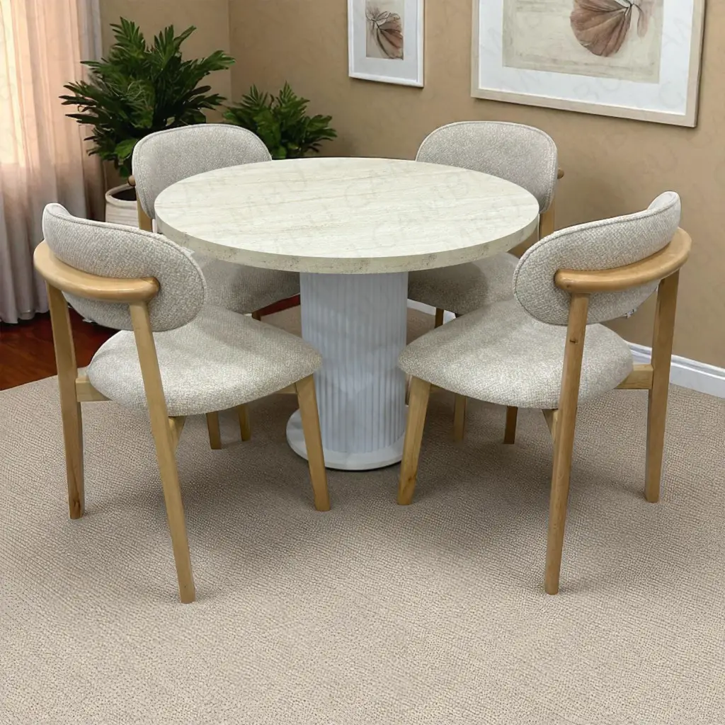 Yuvarlak Bohem Takım, modern ve doğal dokuları bir araya getirerek yaşam alanlarınıza şıklık katar. Traverten desenli yuvarlak masa tablası, beyaz ayak tasarımıyla birleşerek zarif bir kontrast oluşturur. Takımda yer alan 4 adet Norte naturel sandalye ise doğal ahşap görünümüyle mekâna sıcak bir hava katar. Hem estetik hem de dayanıklı yapısıyla uzun yıllar keyifle kullanılabilecek bir masa-sandalye setidir.