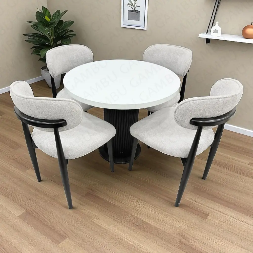 Yuvarlak Bohem Takım, modern çizgileri ve uyumlu renk kombinasyonu ile yaşam alanlarına şıklık katıyor. Takımda yer alan Polo siyah ahşap sandalyeler, dayanıklı yapısı ve ergonomik tasarımı ile uzun süreli konfor sağlar. Seti tamamlayan bohem yuvarlak masa, beyaz üst tablası ve siyah ayaklarıyla hem estetik hem de modern bir görünüm sunar. Ev, kafe ve restoran dekorasyonlarına zarafet ve işlevsellik katan bu takım, sade ve şık tasarımıyla öne çıkıyor.